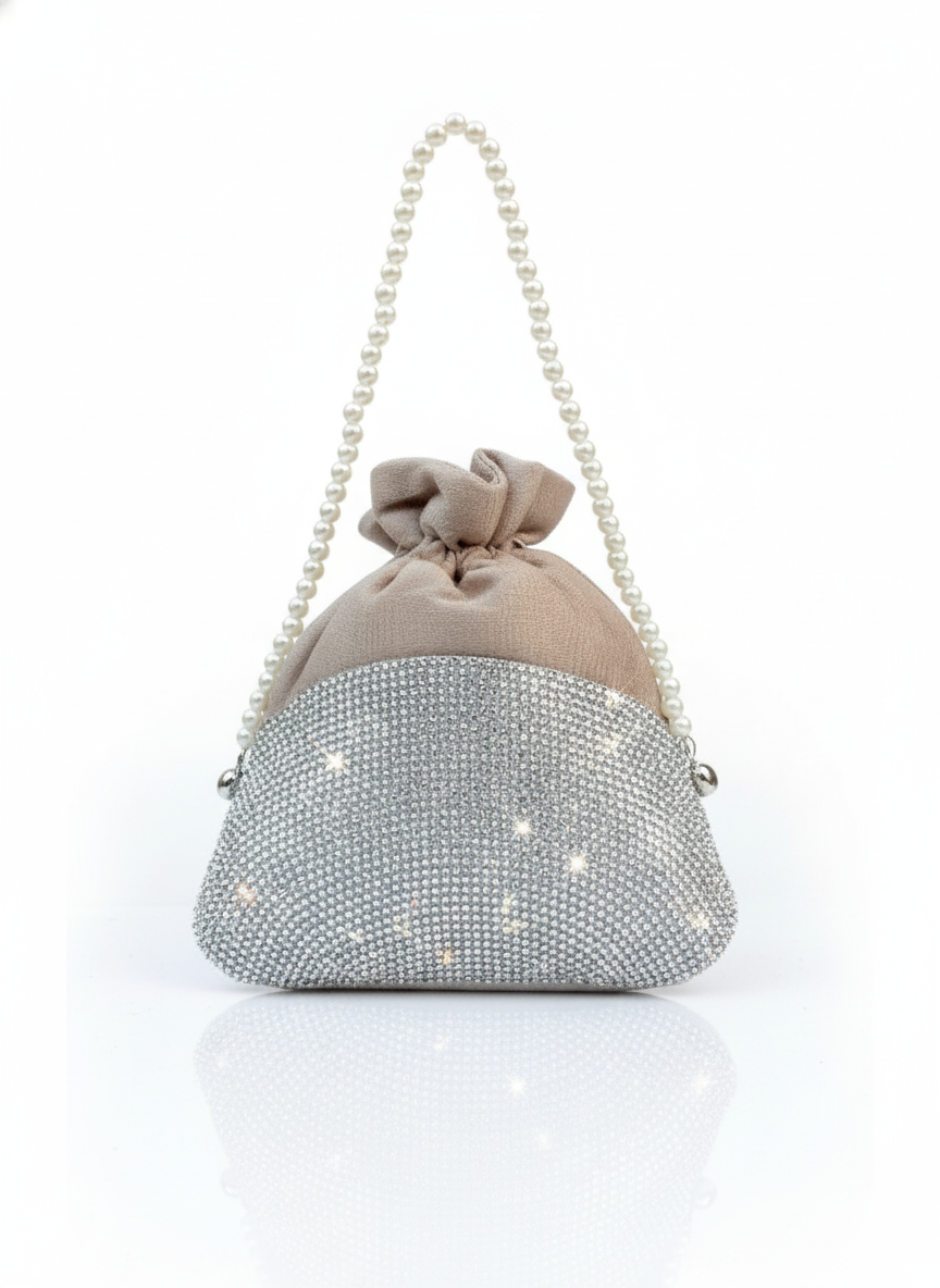 Glamour Glow Pearl Potli Bag – Silver Crystal Wedding Clutch for Women in Pakistan-Silver