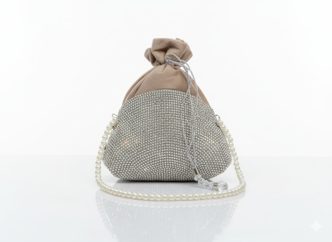 Designed with sparkling silver crystals and finished with a premium pearl handle, this elegant potli is the perfect accessory for brides, bridesmaids, and women attending any special event.