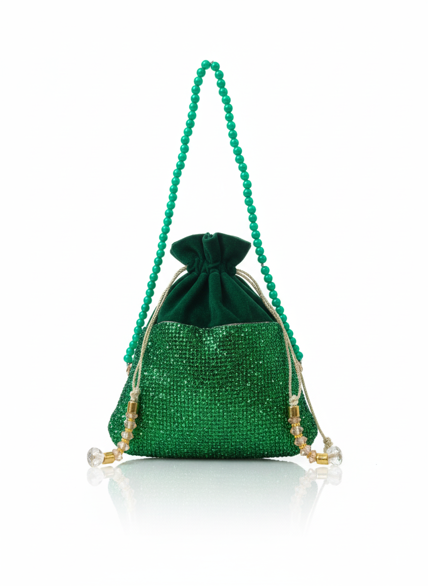 Glamour Glow Pearl Potli Bag – Silver Crystal Wedding Clutch for Women in Pakistan-Green