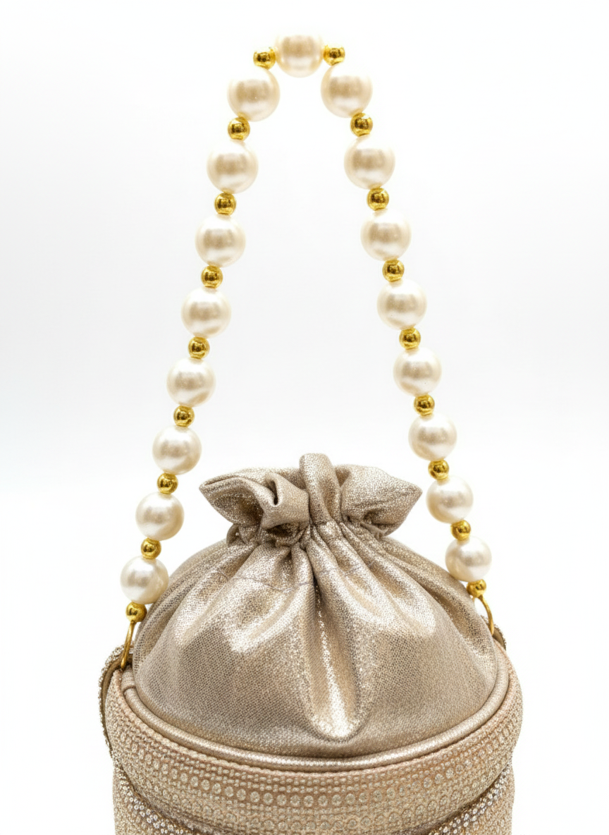 Add a touch of timeless elegance to your wedding look with the Pearl Blossom Bridal Potli by Nayab Khatoon — a premium golden potli bag designed to complement every bridal and festive outfit. Featuring a beautifully handcrafted pearl handle, shimmering gold fabric, and intricate embellishment detailing, this potli is the perfect blend of luxury, tradition, and modern style.