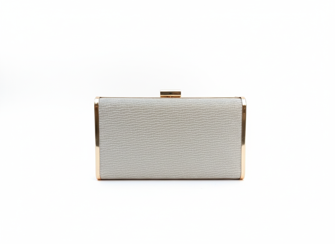 Designed in a soft ivory tone with a subtle wave-textured surface, this premium evening clutch blends sophistication with modern minimalism. The sleek gold metal frame enhances its luxury appeal, making it an ideal accessory for bridal wear, formal outfits, and special events.