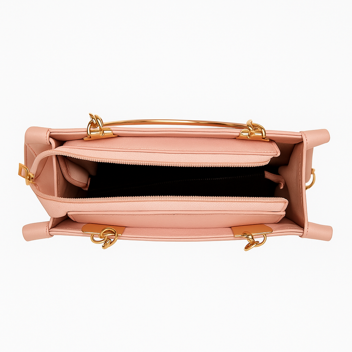 pgrade your style with the Pretty Blush Boxy Bag by Nayab Khatoon. Designed for modern women, this elegant handbag features a structured box shape, luxurious blush pink color, and gold-tone metal handle that adds a classy touch. It comes with a detachable shoulder strap, making it perfect for both formal gatherings and casual outings. The inner compartments provide ample space for all your essentials, keeping you stylish and organized all day